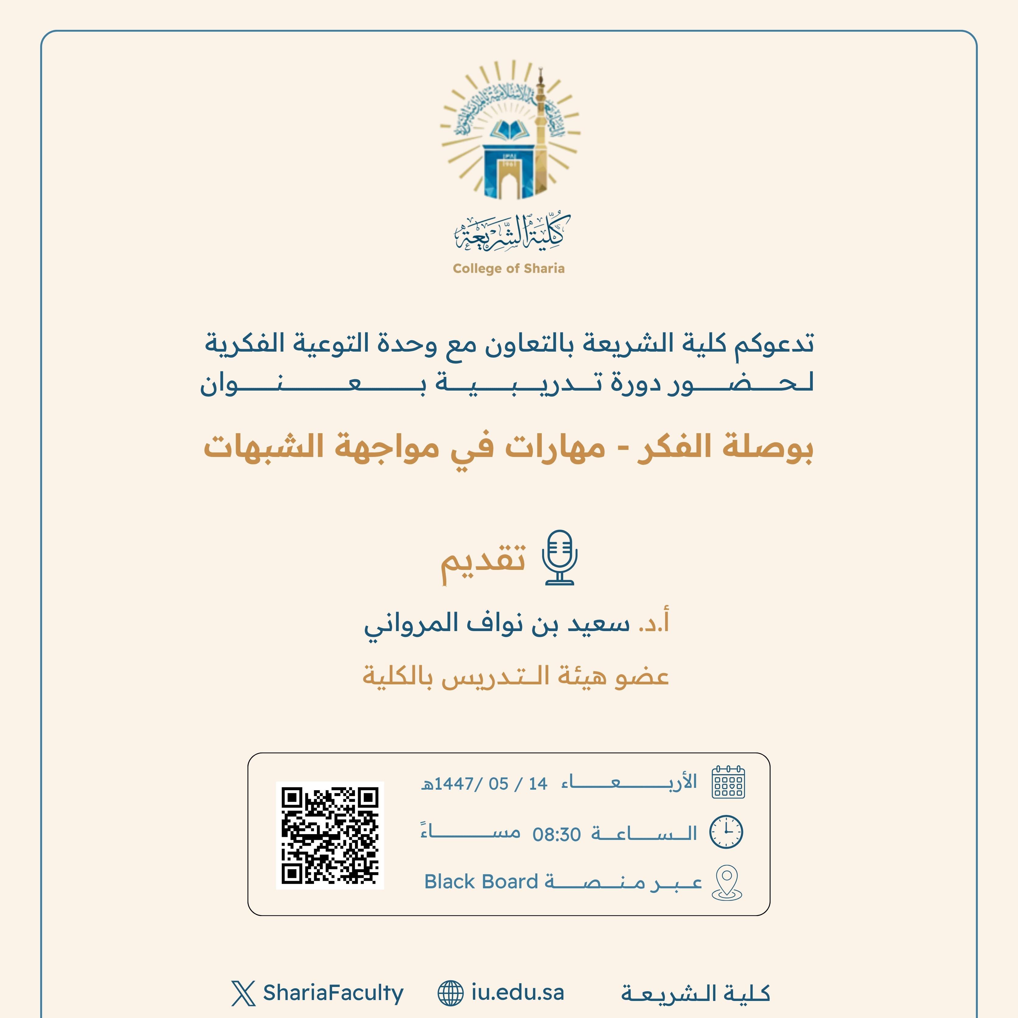 تنفيذ دورة تدريبية توعوية عن بعد في كلية الشريعة بالتعاون مع وحدة التوعية الفكرية يوم الأربعاء 14-جمادى الأولى-1447