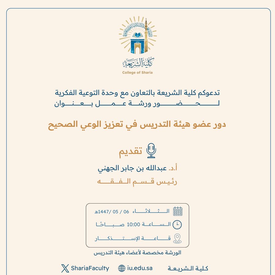 تدعوكم #كلية_الشريعة بالتعاون مع #وحدة_التوعية_الفكرية لحضور ورشة عمل بعنوان: