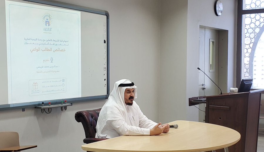 #تغطية أقامت #كلية_الشريعة بالتعاون مع #وحدة_التوعية_الفكرية صباح يوم الأربعاء لقاء أكاديميًا عن خصائص الطالب الواعي، ألقاه فضيلة د. سالم بن محمد خريشي في قاعة الاستذكار، بحضور طلاب الكلية ومنسوبيها.