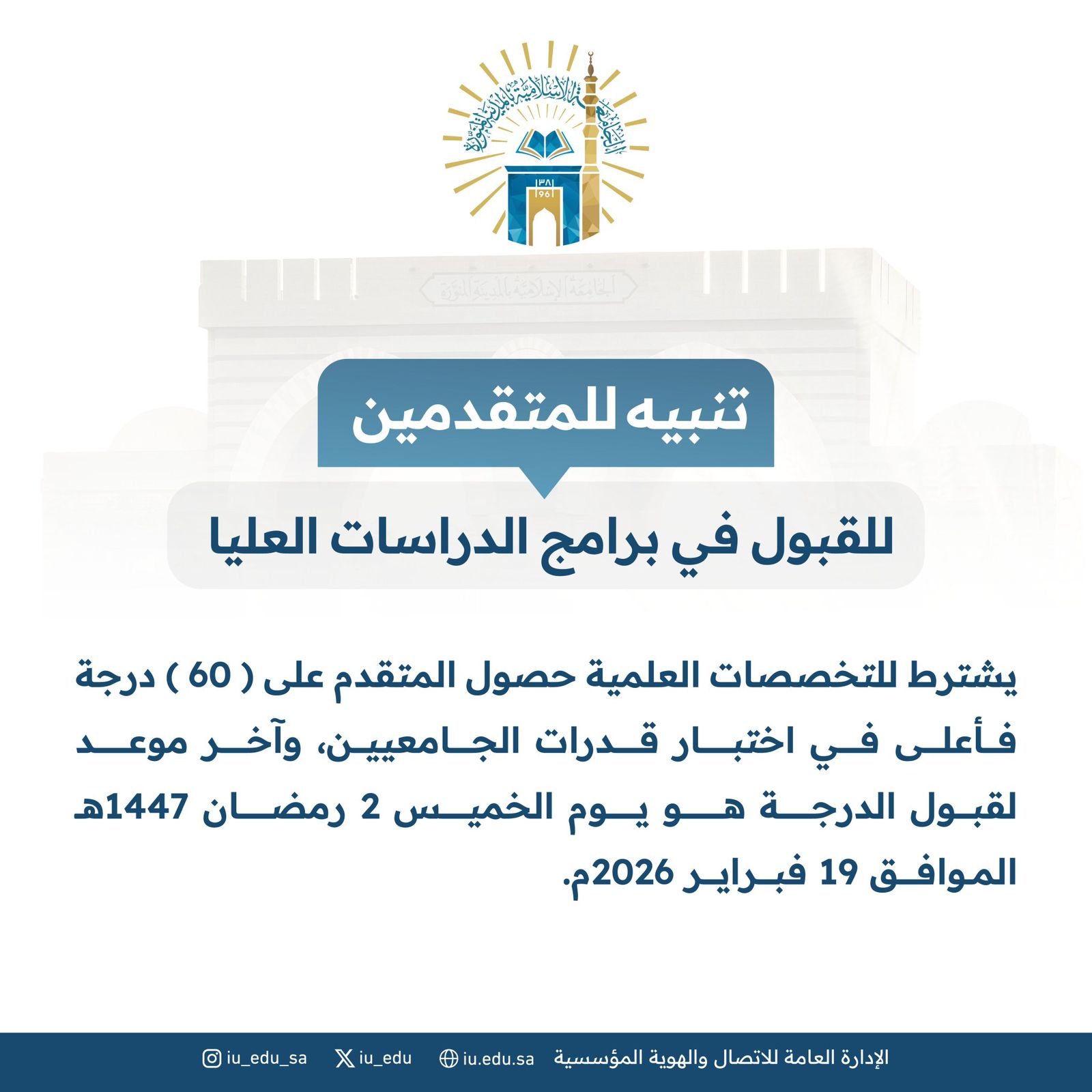 تنبيه‬⁩: يشترط للمتقدمين على التخصصات العلمية درجة (60) فأعلى في اختبار قدرات الجامعيين، وآخر موعد لقبول الدرجة هو يوم الخميس 2 رمضان 1447هـ الموافق 19 فبراير 2026م