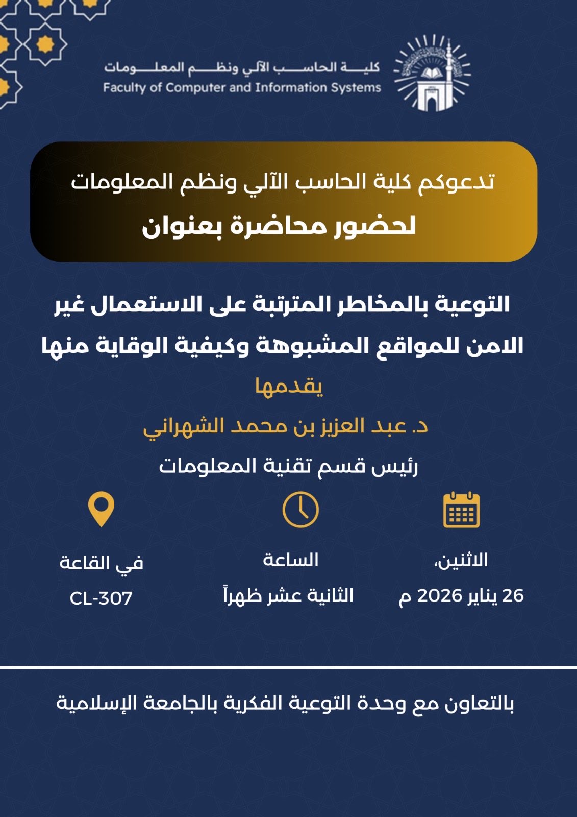 تنفيذ لقاء توعوي لطلاب كلية الحاسب الآلي بالتعاون مع وحدة التوعية الفكرية يوم الاثنين 07-شعبان-1447