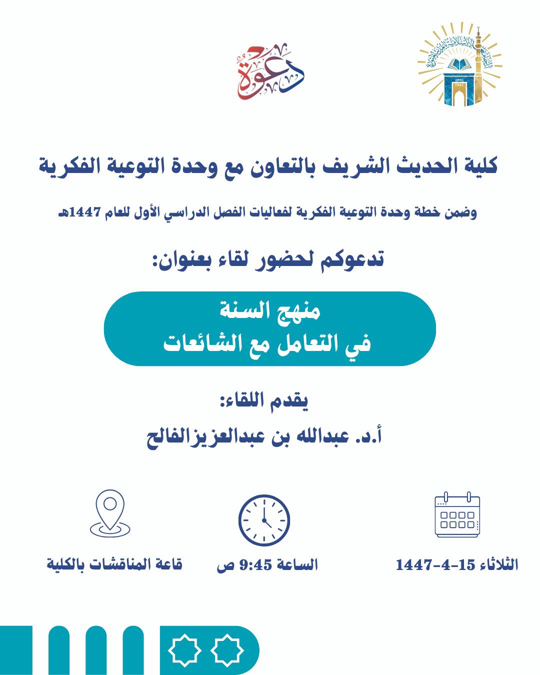 تنفيذ لقاء توعوي لطلاب كلية الحديث الشريف بالتعاون مع وحدة التوعية الفكرية يوم الثلاثاء 15-ربيع الثاني-1447