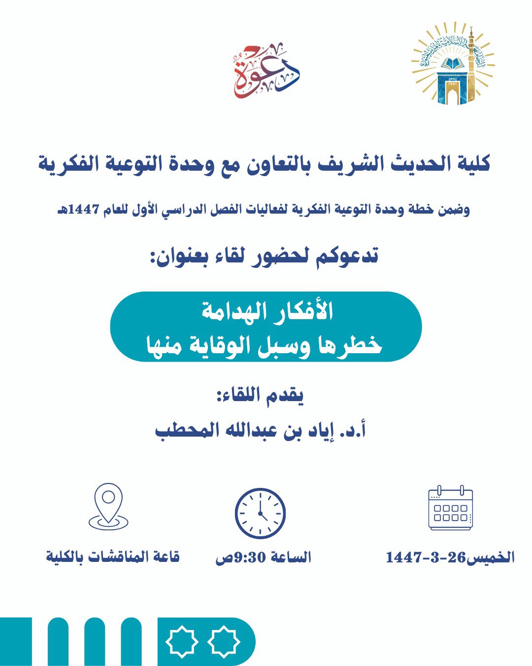 تنفيذ لقاء توعوي لطلاب كلية الحديث الشريف بالتعاون مع وحدة التوعية الفكرية يوم الخميس 26-ربيع الأول-1447