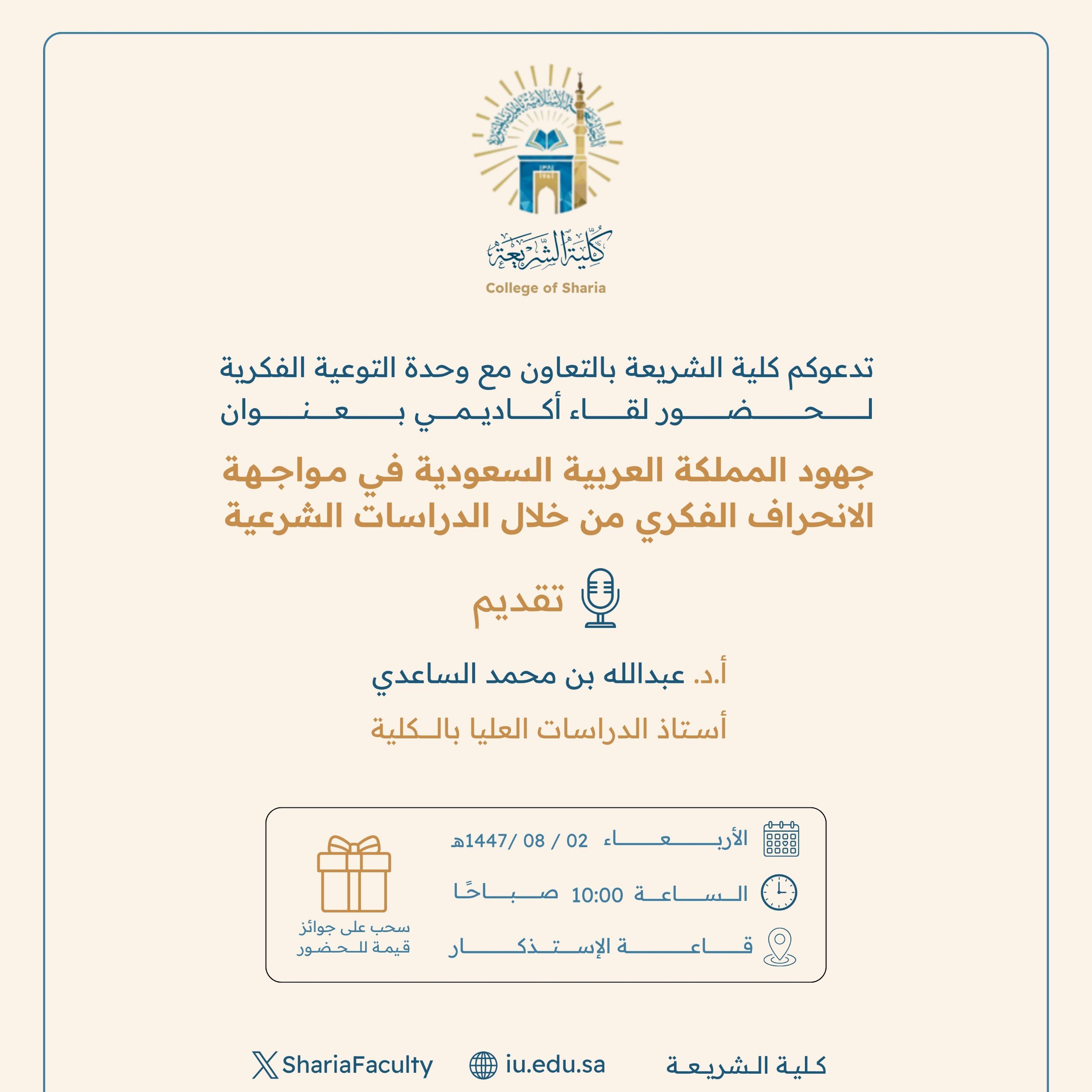 تنفيذ لقاء توعوي لطلاب كلية الشريعة بالتعاون مع وحدة التوعية الفكرية يوم الأربعاء 02-شعبان-1447