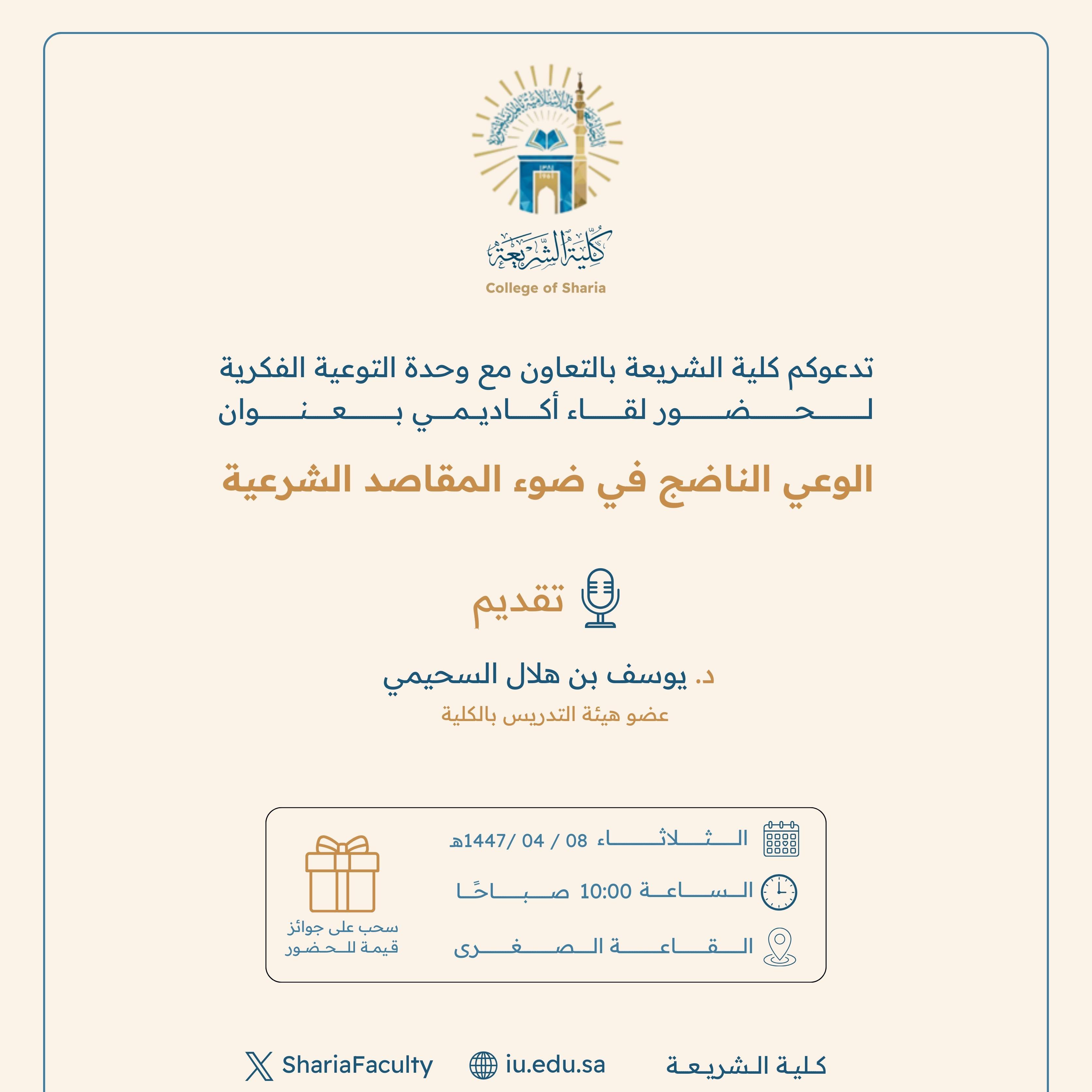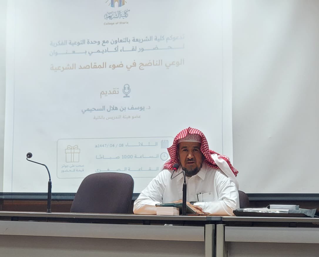 تنفيذ لقاء توعوي لطلاب كلية الشريعة بالتعاون مع وحدة التوعية الفكرية يوم الثلاثاء 08-ربيع الثاني-1447