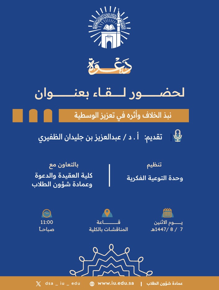 تنفيذ لقاء توعوي لطلاب كلية العقيدة بالتعاون مع وحدة التوعية الفكرية يوم الاثنين 07-شعبان-1447