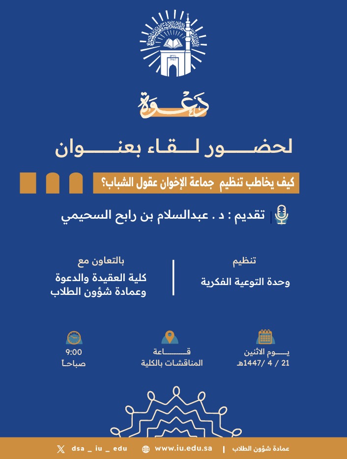 تنفيذ لقاء توعوي لطلاب كلية العقيدة والدعوة بالتعاون مع وحدة التوعية الفكرية يوم الاثنين 21-ربيع الثاني-1447