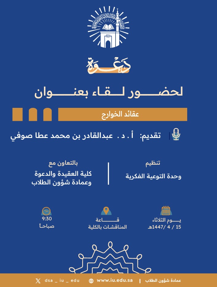 تنفيذ لقاء توعوي لطلاب كلية العقيدة والدعوة بالتعاون مع وحدة التوعية الفكرية يوم الثلاثاء 15-ربيع الثاني-1447
