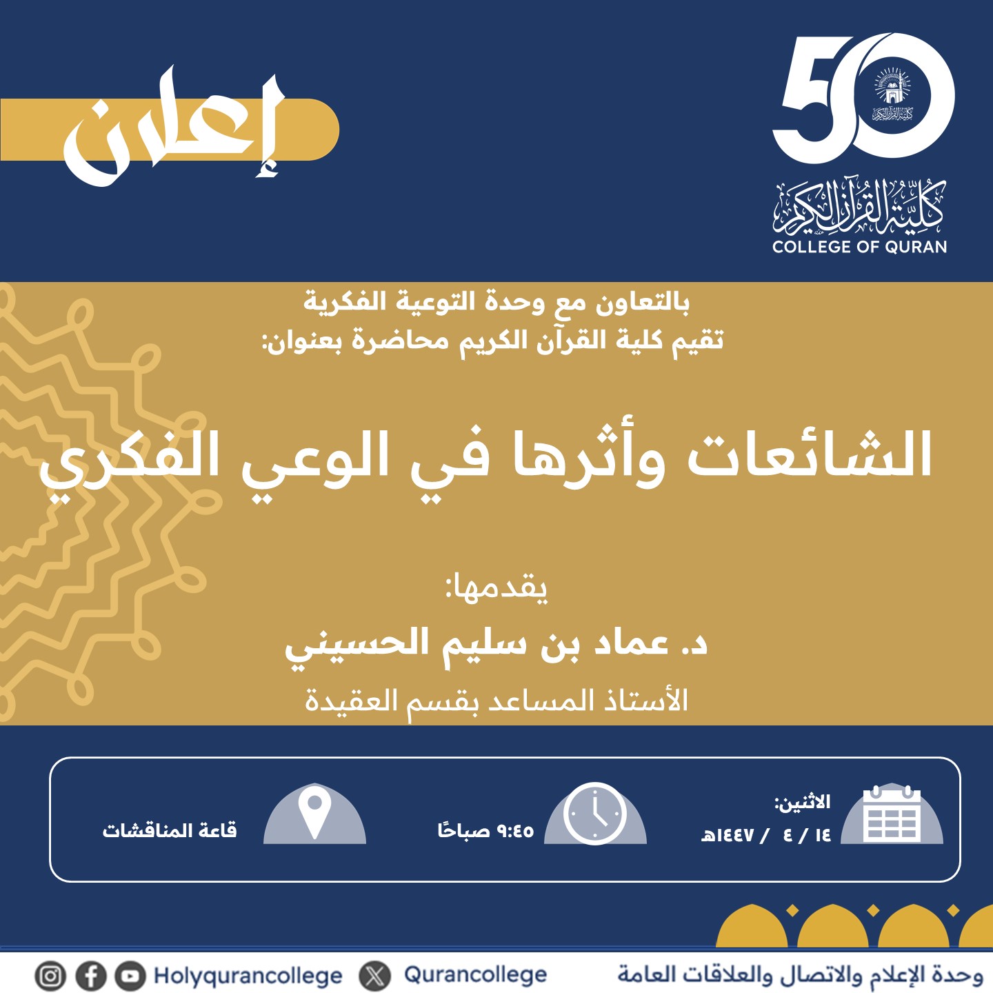 تنفيذ لقاء توعوي لطلاب كلية القرآن الكريم بالتعاون مع وحدة التوعية الفكرية يوم الاثنين 14-ربيع الثاني-1447