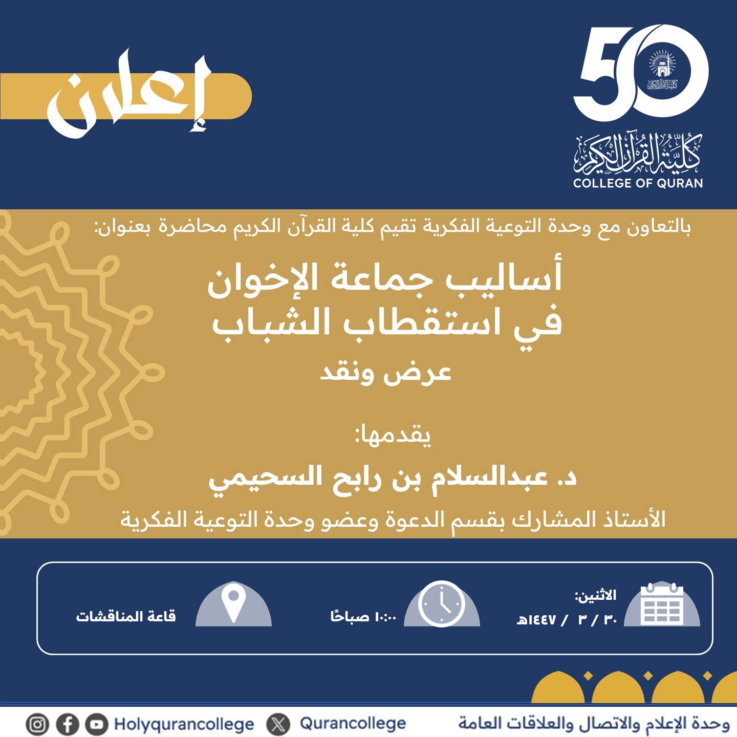 تنفيذ لقاء توعوي لطلاب كلية القرآن الكريم بالتعاون مع وحدة التوعية الفكرية يوم الاثنين 30-ربيع الأول-1447