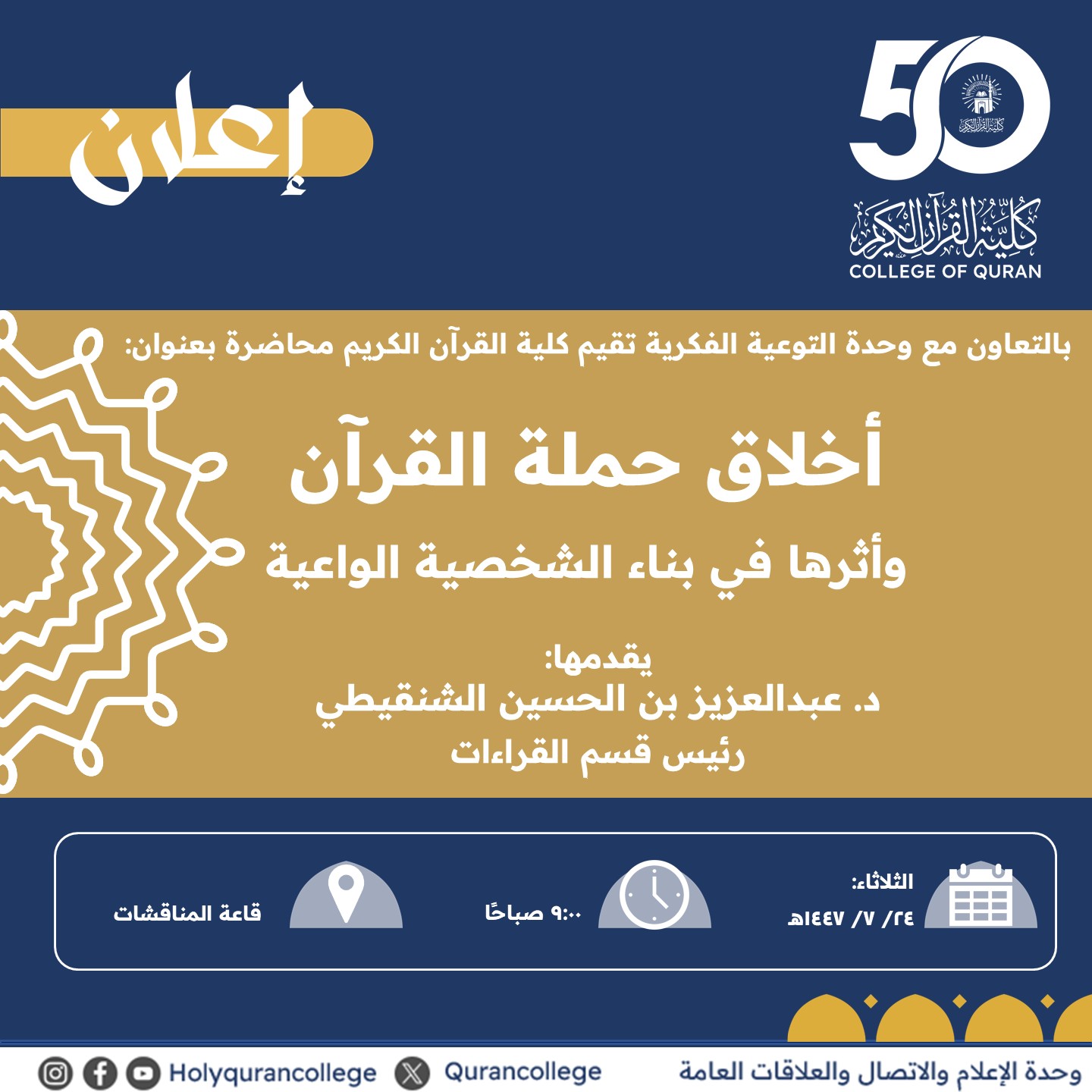 تنفيذ لقاء توعوي لطلاب كلية القرآن الكريم بالتعاون مع وحدة التوعية الفكرية يوم الثلاثاء 24-رجب-1447