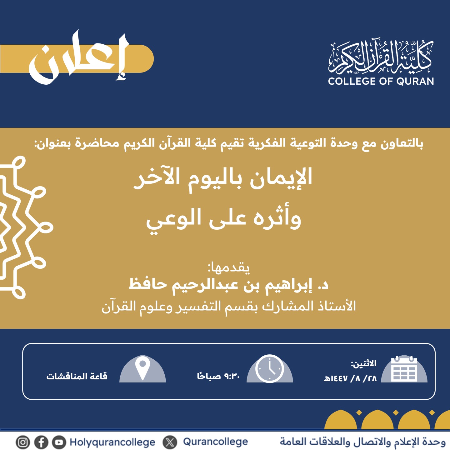 تنفيذ لقاء توعوي لطلاب كلية القرآن بالتعاون مع وحدة التوعية الفكرية يوم الاثنين 28-شعبان-1447