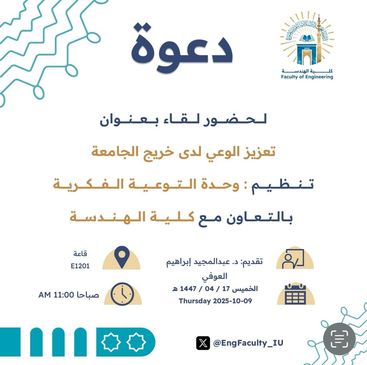 تنفيذ لقاء توعوي لطلاب كلية الهندسة بالتعاون مع وحدة التوعية الفكرية يوم الخميس 17-ربيع الثاني-1447