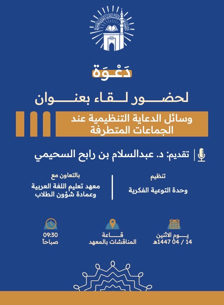 تنفيذ لقاء توعوي لطلاب معهد تعليم اللغة العربية بالتعاون مع وحدة التوعية الفكرية يوم الاثنين 14-ربيع الثاني-1447