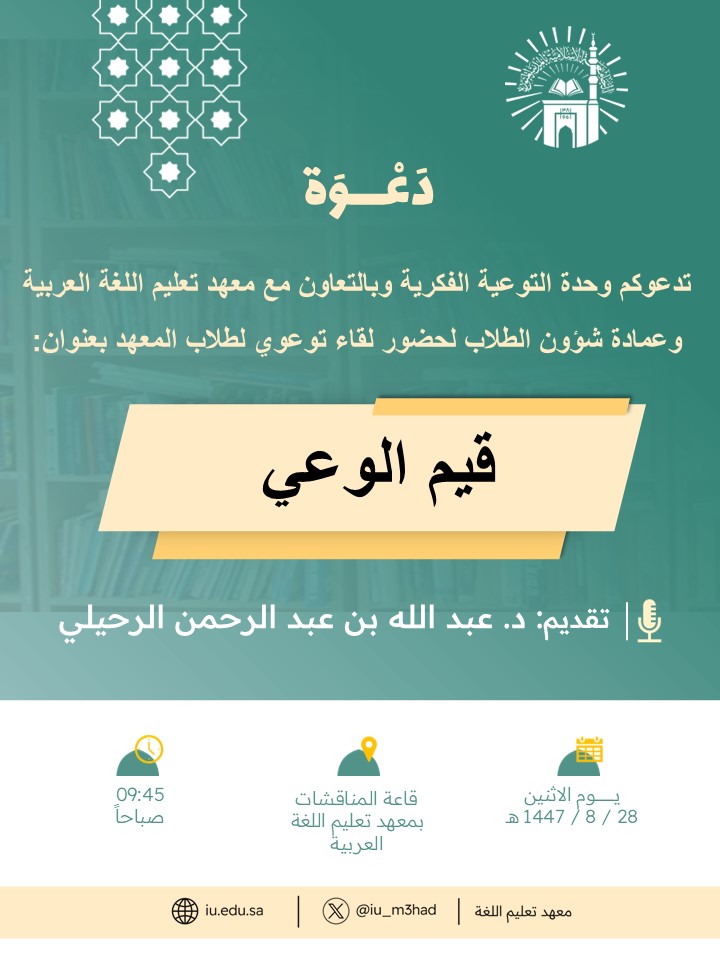 تنفيذ لقاء توعوي لطلاب معهد تعليم اللغة العربية بالتعاون مع وحدة التوعية الفكرية يوم الاثنين 28-شعبان-1447