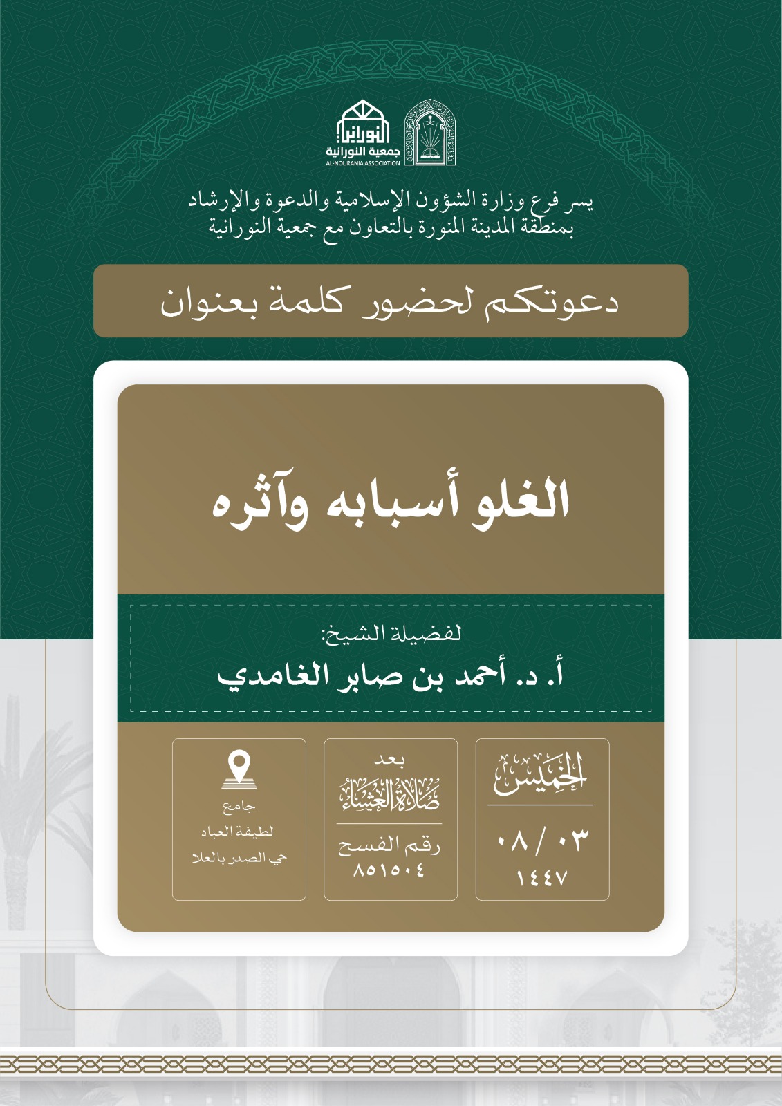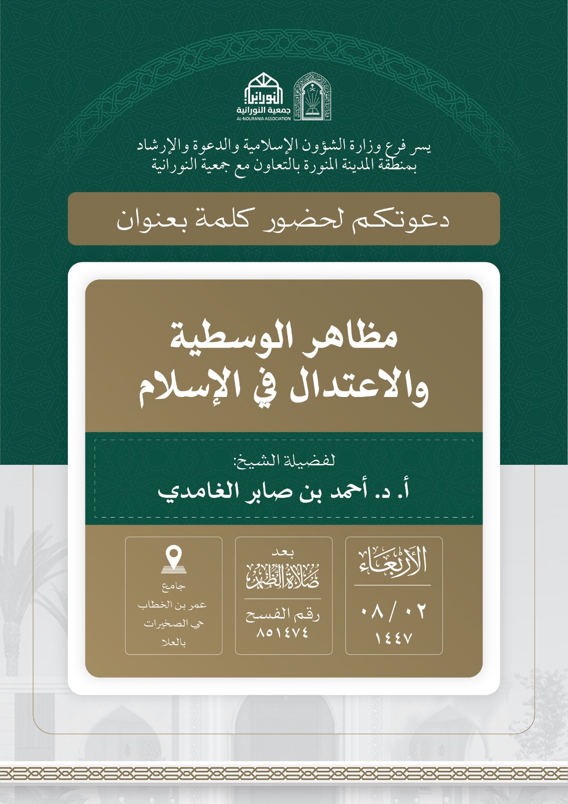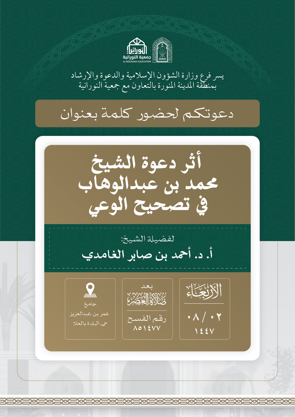 تنفيذ 10 محاضرات في البرنامج الدعوي لمحافظة العلا قدمها فضيلة الدكتور أحمد بن صابر الغامدي