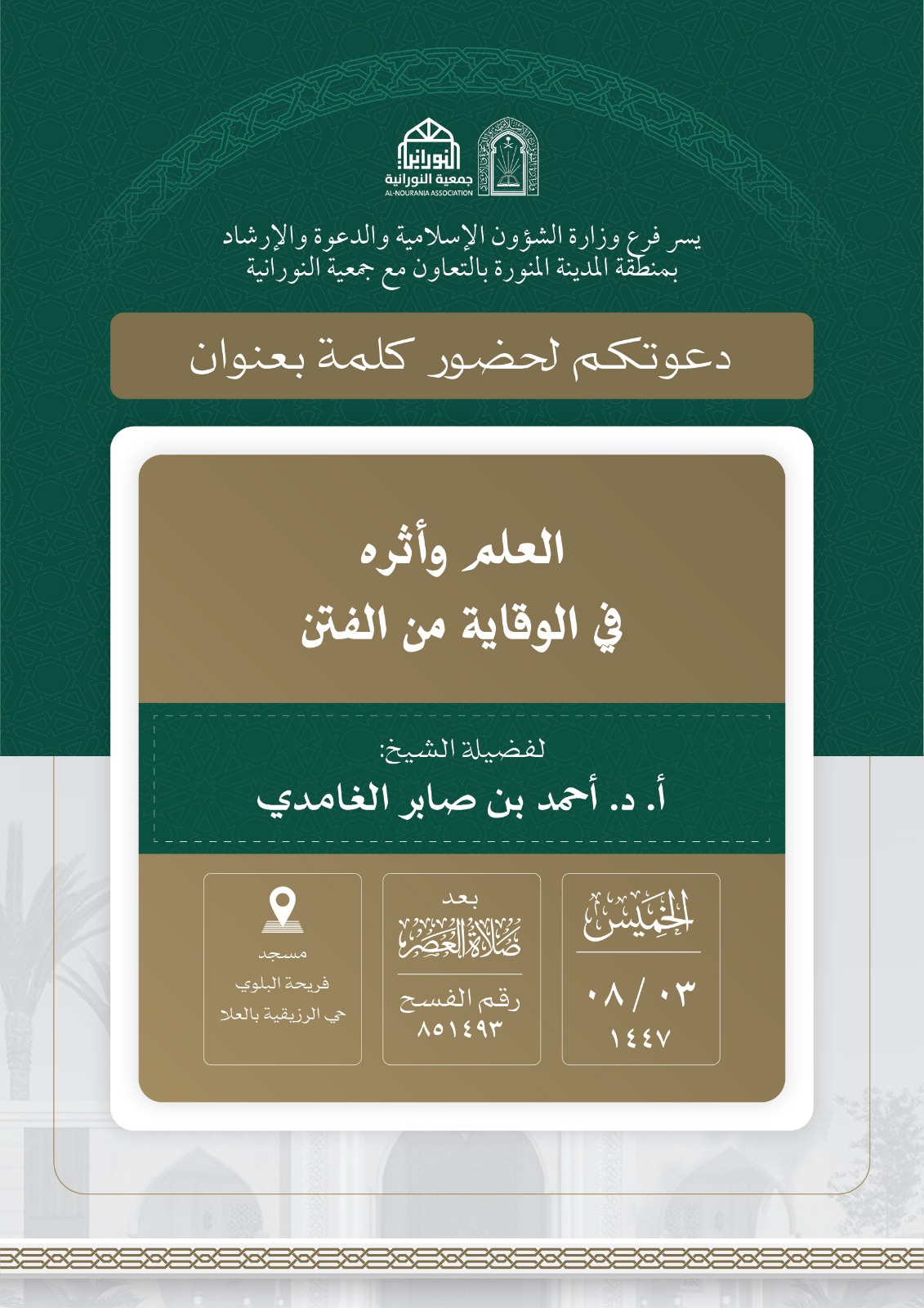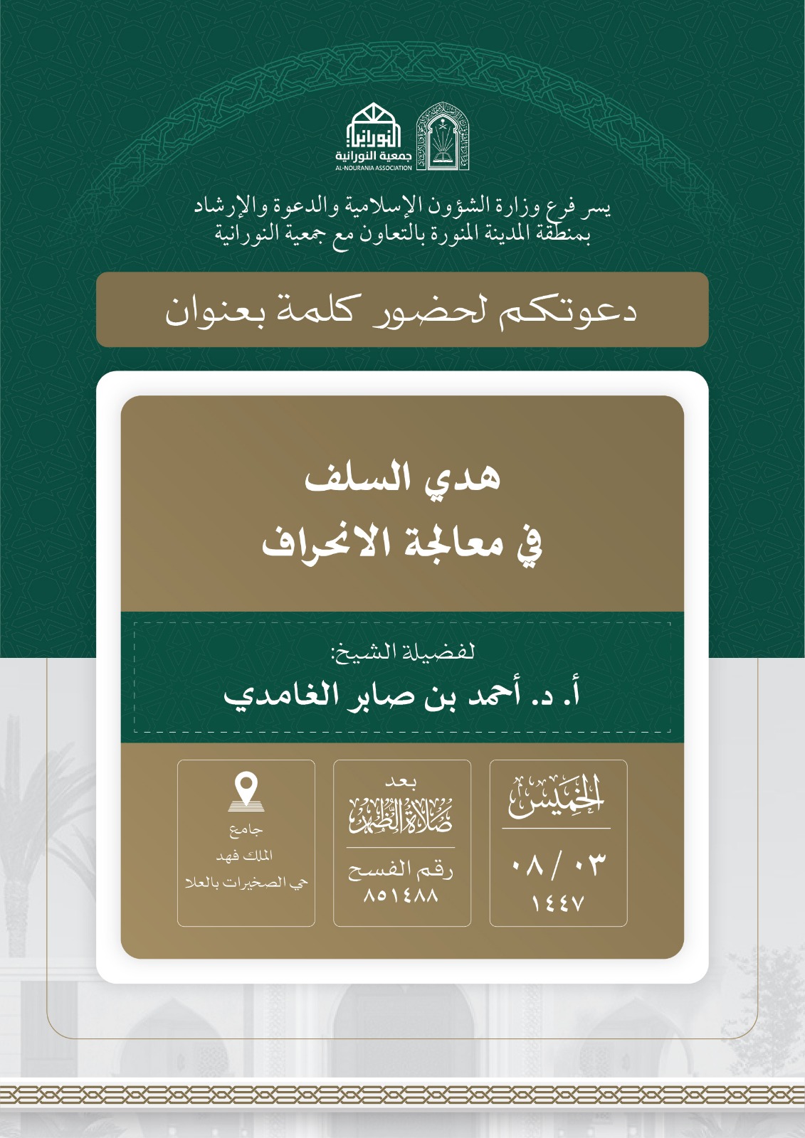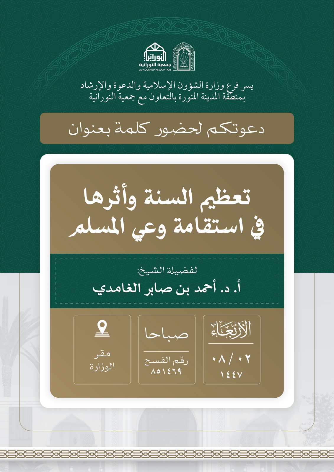 تنفيذ 10 محاضرات في البرنامج الدعوي لمحافظة العلا قدمها فضيلة الدكتور أحمد بن صابر الغامدي