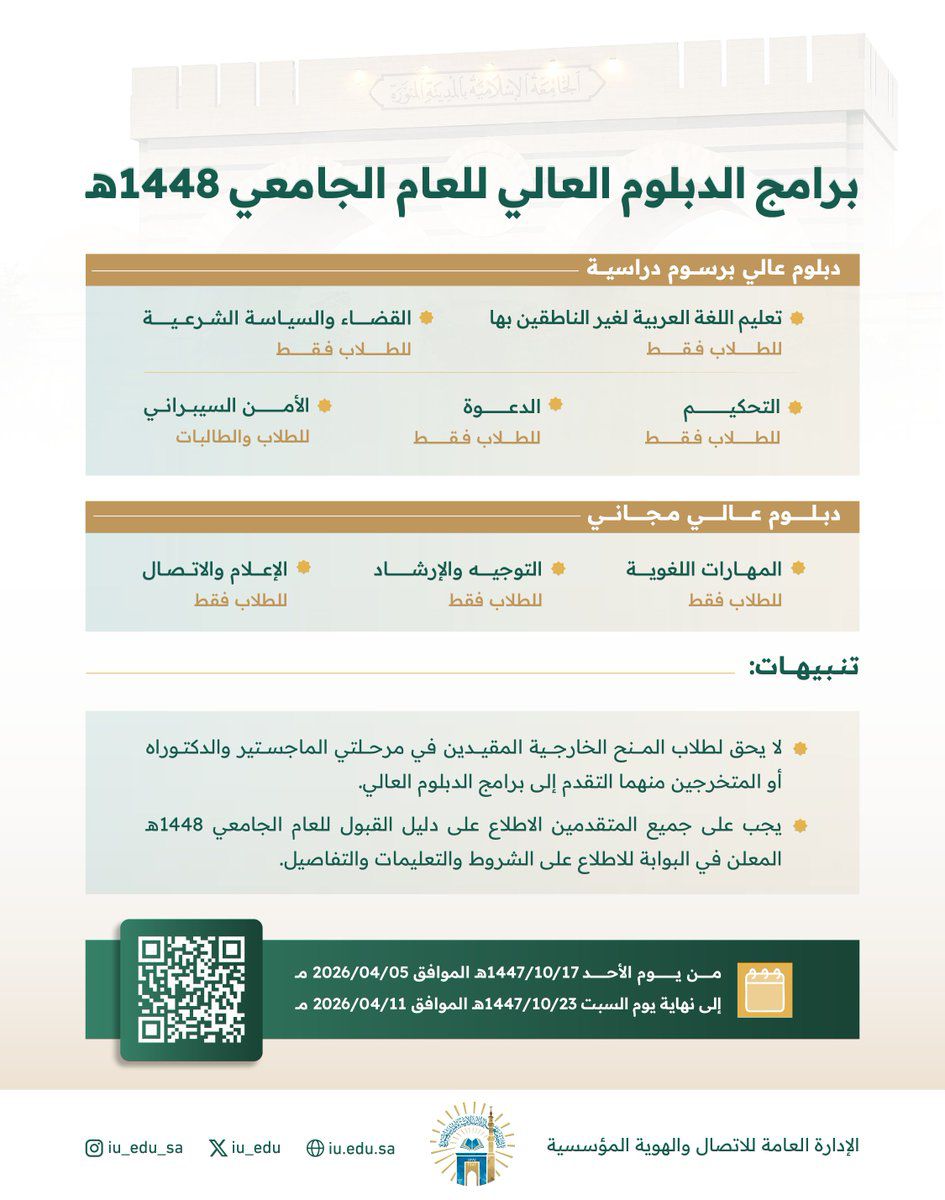 فتح باب القبول في برامج الدبلوم العالي للعام الجامعي 1448 هـ. بداية التقديم يوم الأحد الموافق 17 شوال 1447هـ حتى نهاية يوم السبت الموافق 23 شوال 1447