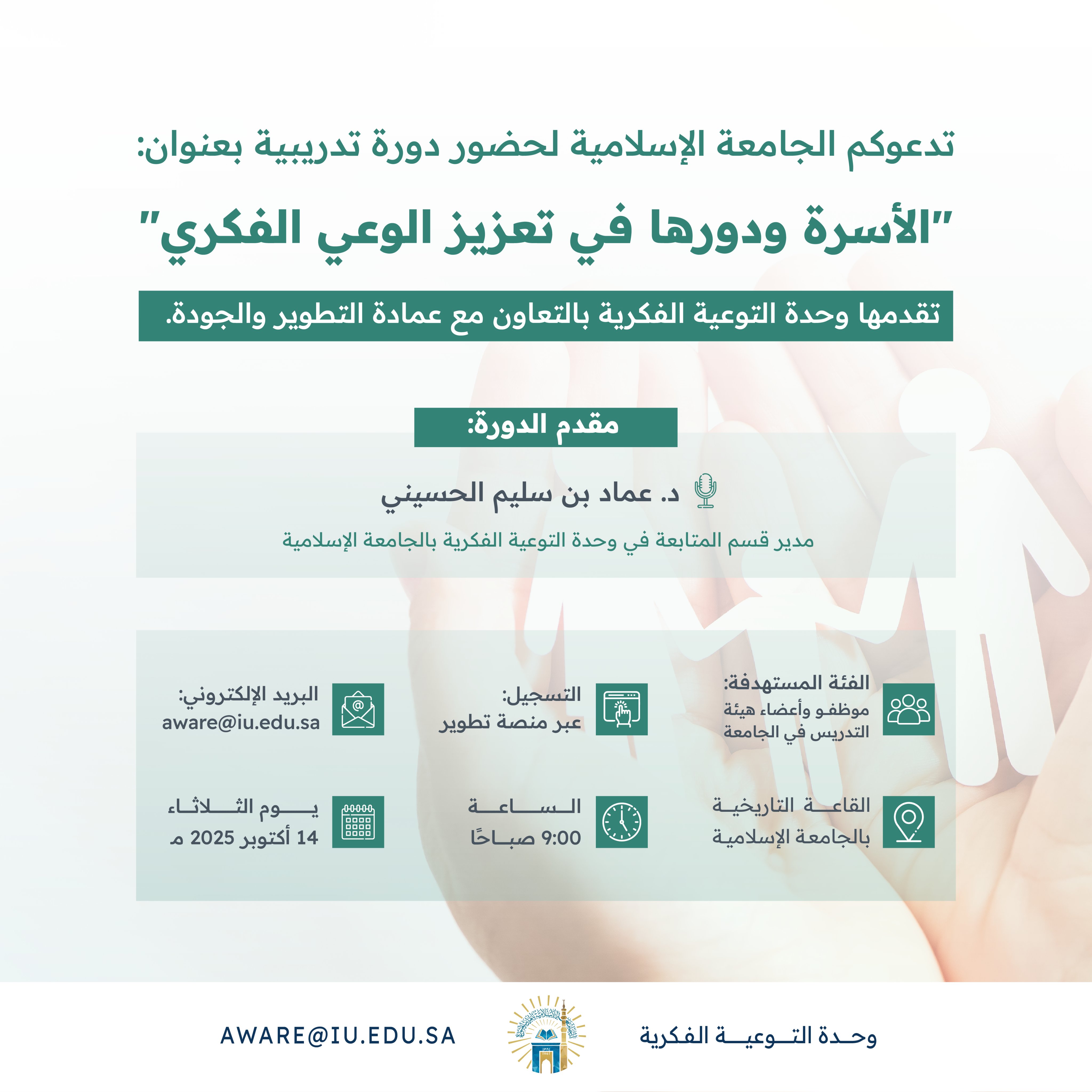 نظمت وحدة التوعية الفكرية في الجامعة الإسلامية ورشة تدريبية بعنوان (الأسرة ودورها في تعزيز الوعي الفكري) قدمها الدكتور عماد بن سليم الحسيني، عضو وحدة التوعية الفكرية، يوم الثلاثاء 22/ربيع الثاني/1447ه، في القاعة التاريخية بالجامعة، واستهدفت منسوبي الجامعة وأعضاء هيئة التدريس؛ تعزيزًا للوعي الفكري وترسيخًا لقيم الوسطية.