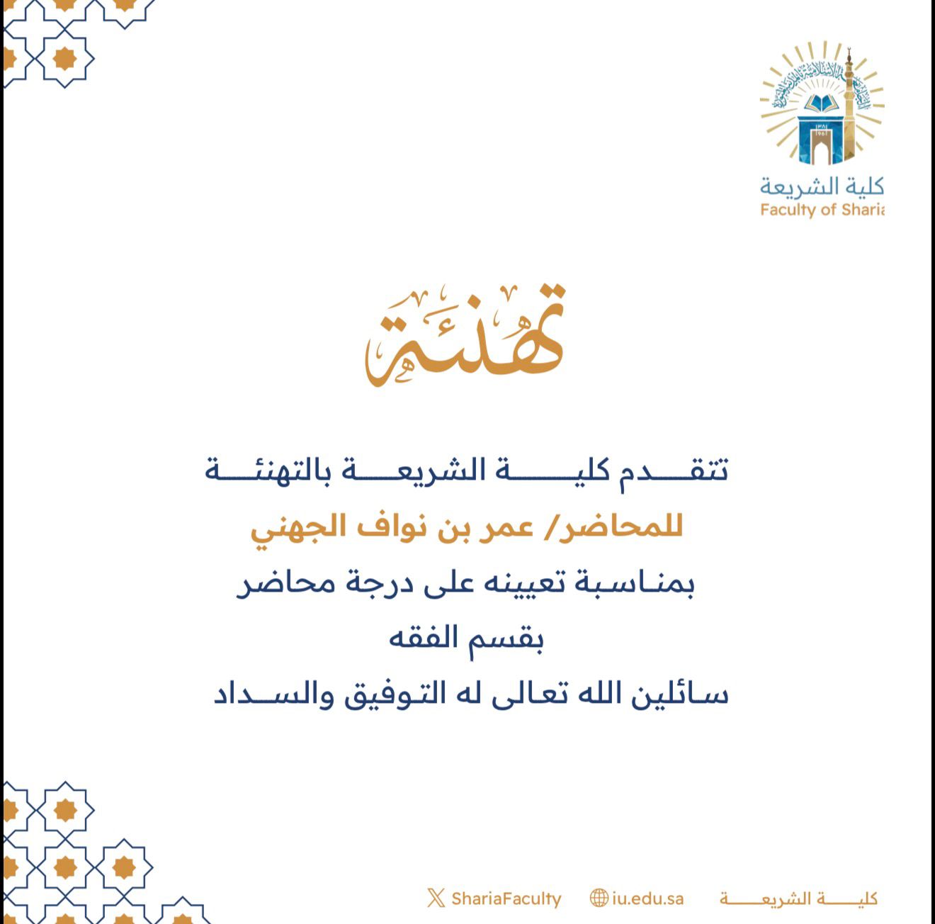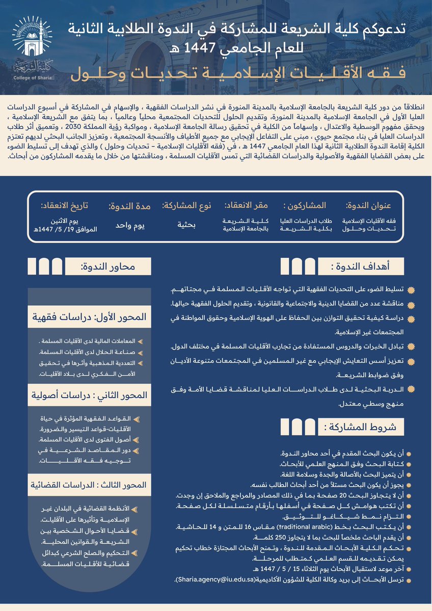 أنشئت الكلية في نفس السنة التي أنشئت فيها الجامعة في الخامس والعشرين من الشهر الثالث للعام 1381 للهجرة الشريفة بالأمر السامي رقم (11) الذي صودق بموجبه على النظام الأساسي للجامعة الإسلامية، حيث تضمن النظام الأساسي في مادته السابعة أن الجامعة تتكون من قسمين عالٍ، وثانوي، والقسم العالي هو النواة الأولى للكلية التي حملت فيما بعد اسم (كلية الشريعة). وبدأت الدراسة في 2 / 6/ 1381هـ وبعدد ( 85 طالباً ) ، ويجاوز عدد طلابها في الوقت الحالي 7.500 طالباً.