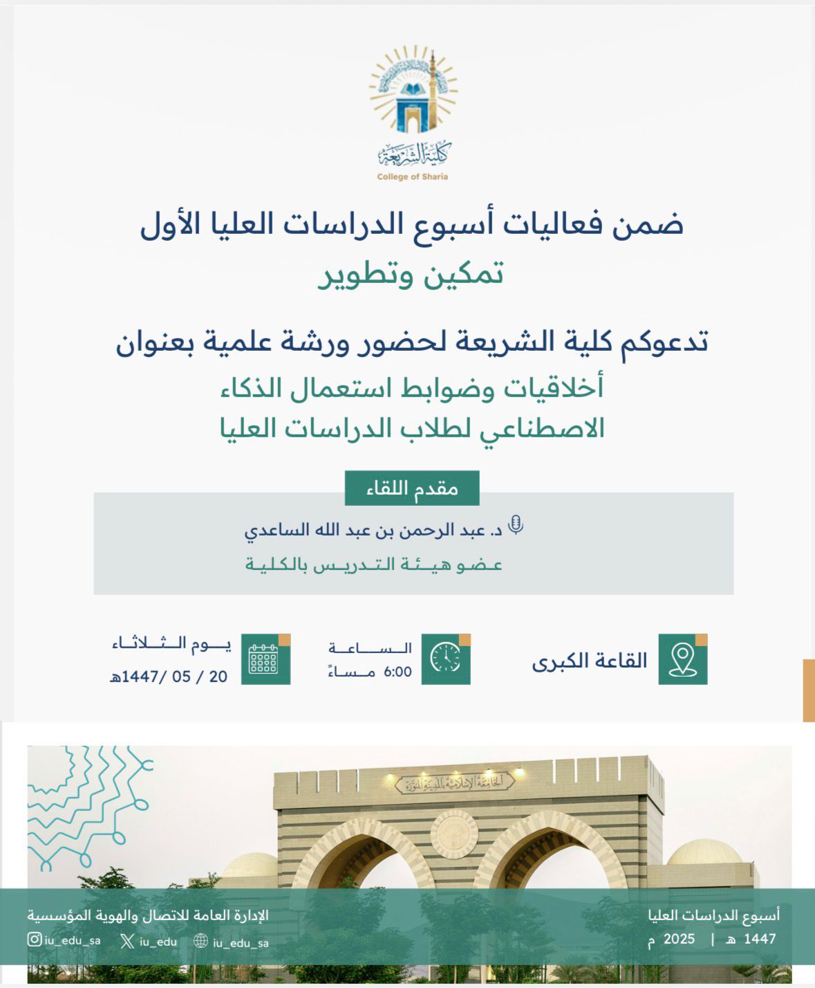 بمناسبة #أسبوع_الدراسات_العليا الأول تحت شعار (#تمكين_وتطوير) تُقيم #كلية_الشريعة بالتعاون مع #عمادة_الدراسات_العليا مجموعة من الفعاليات المتنوعة، ابتداءً من يوم الأحد الموافق ١٨-٥-١٤٤٧هـ وحتى يوم الأربعاء الموافق ٢١-٥-١٤٤٧هـ. وتدعو الكلية أعضاء هيئة التدريس وطلاب الدراسات العليا لحضور هذه الفعاليات والمشاركة لتحقيق أهداف الفعاليات وتنمية المهارات العلمية والبحثية. #الجامعة_الإسلامية