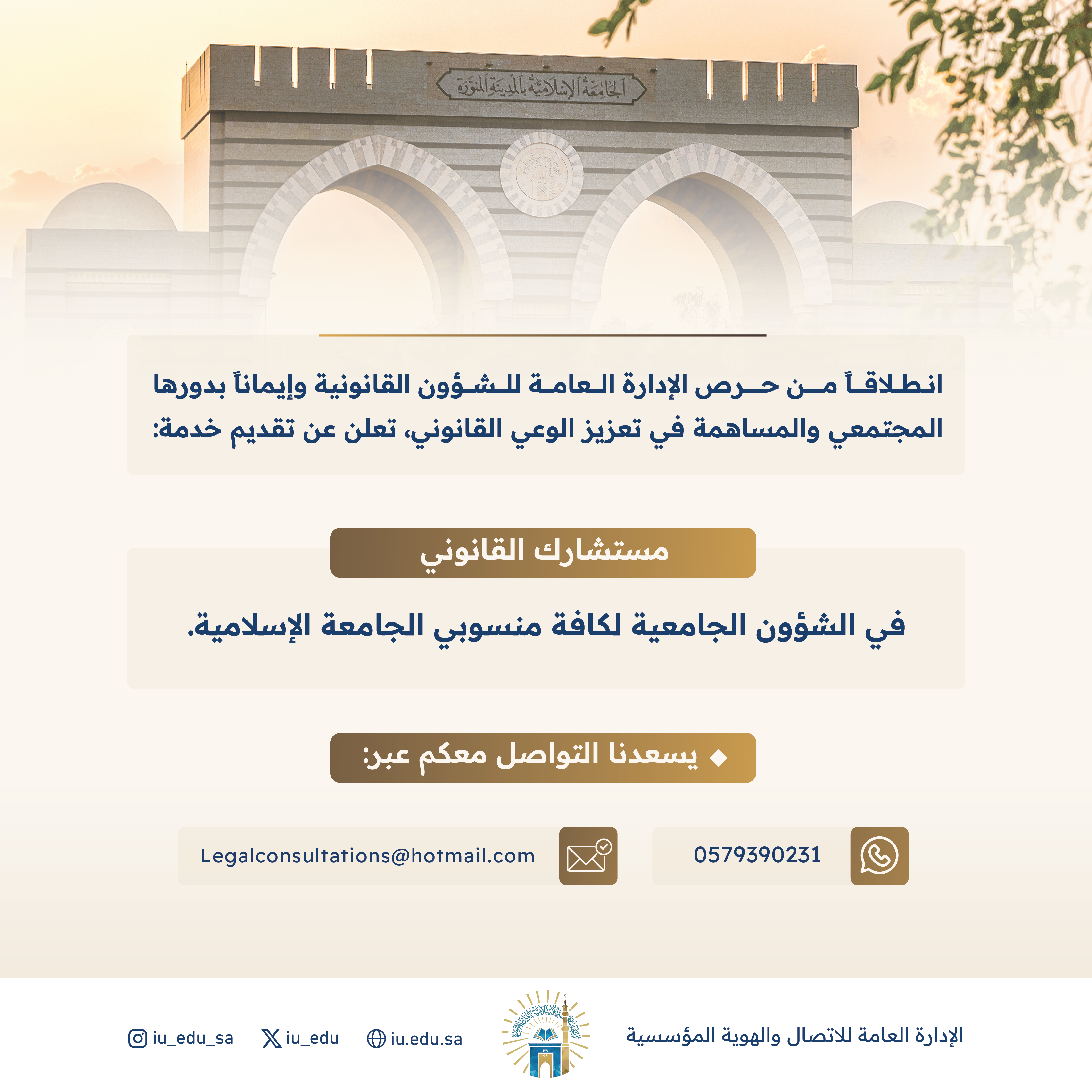 تقدم الإدارة العامة للشؤون القانونية خدمة "مستشارك القانوني"، للإجابة عن الاستفسارات، وتقديم الاستشارات لمنسوبي الجامعة.