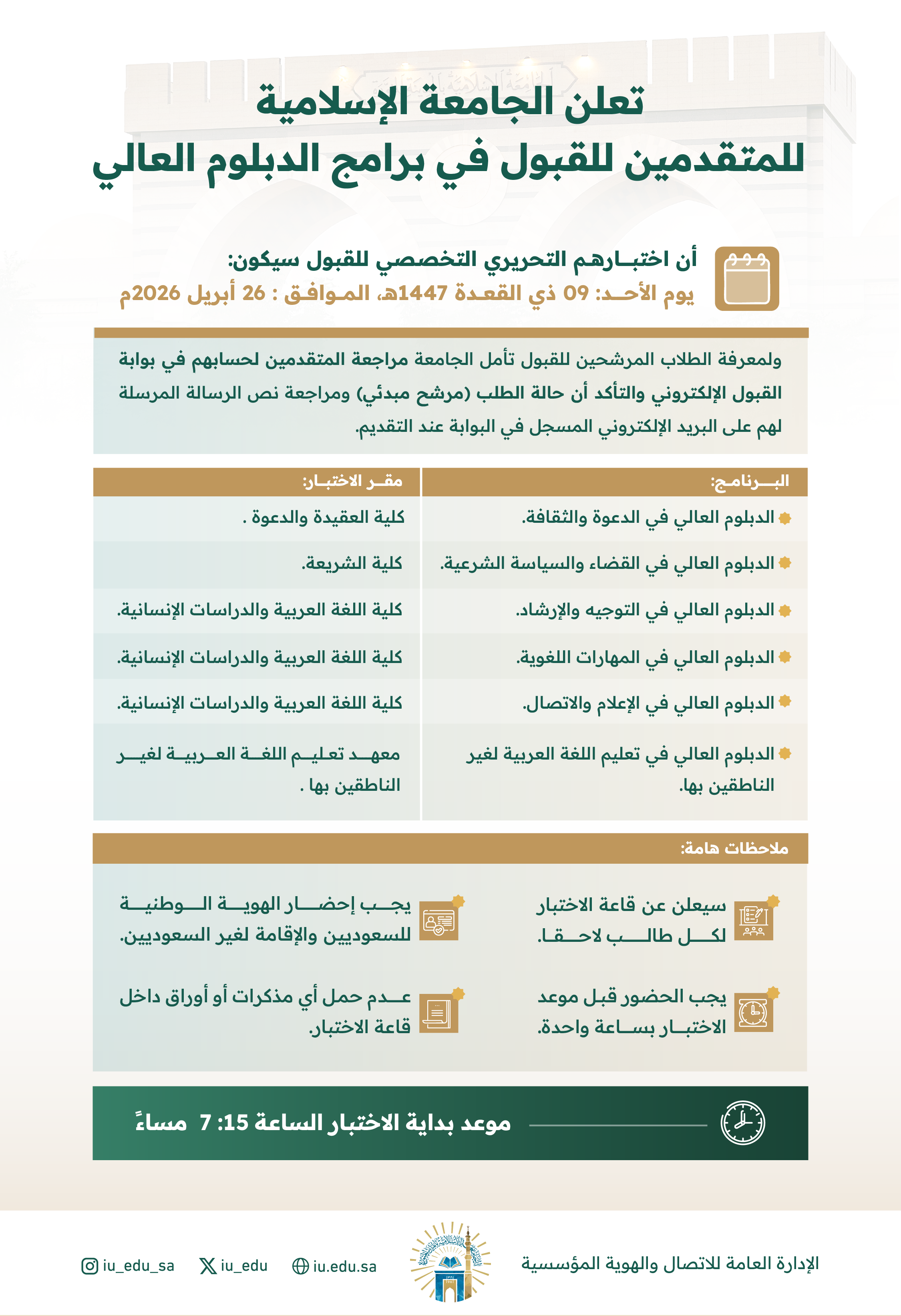 إعلان للمتقدمين لبرامج الدبلوم العالي عن موعد الاختبار التحريري التخصصي للقبول للعام 1448هـ