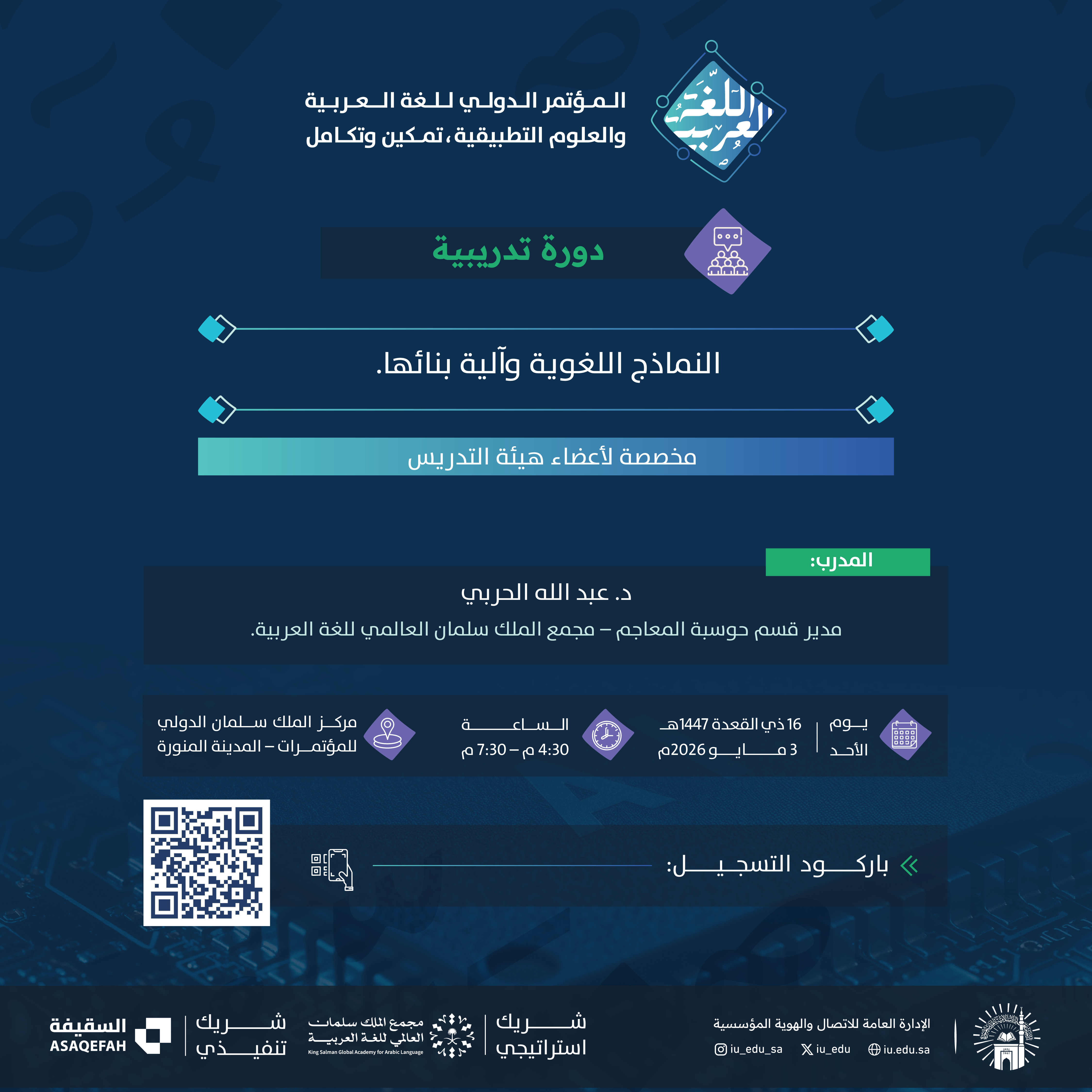 يقدم المؤتمر الدولي: اللغة العربية والعلوم التطبيقية دورة تدريبية بعنوان: "النماذج اللغوية وآلية بنائها"