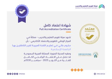 شهادة اعتماد كامل لبرنامج الدبلوم العالي في تعليم اللغة العربية لغير الناطقين بها