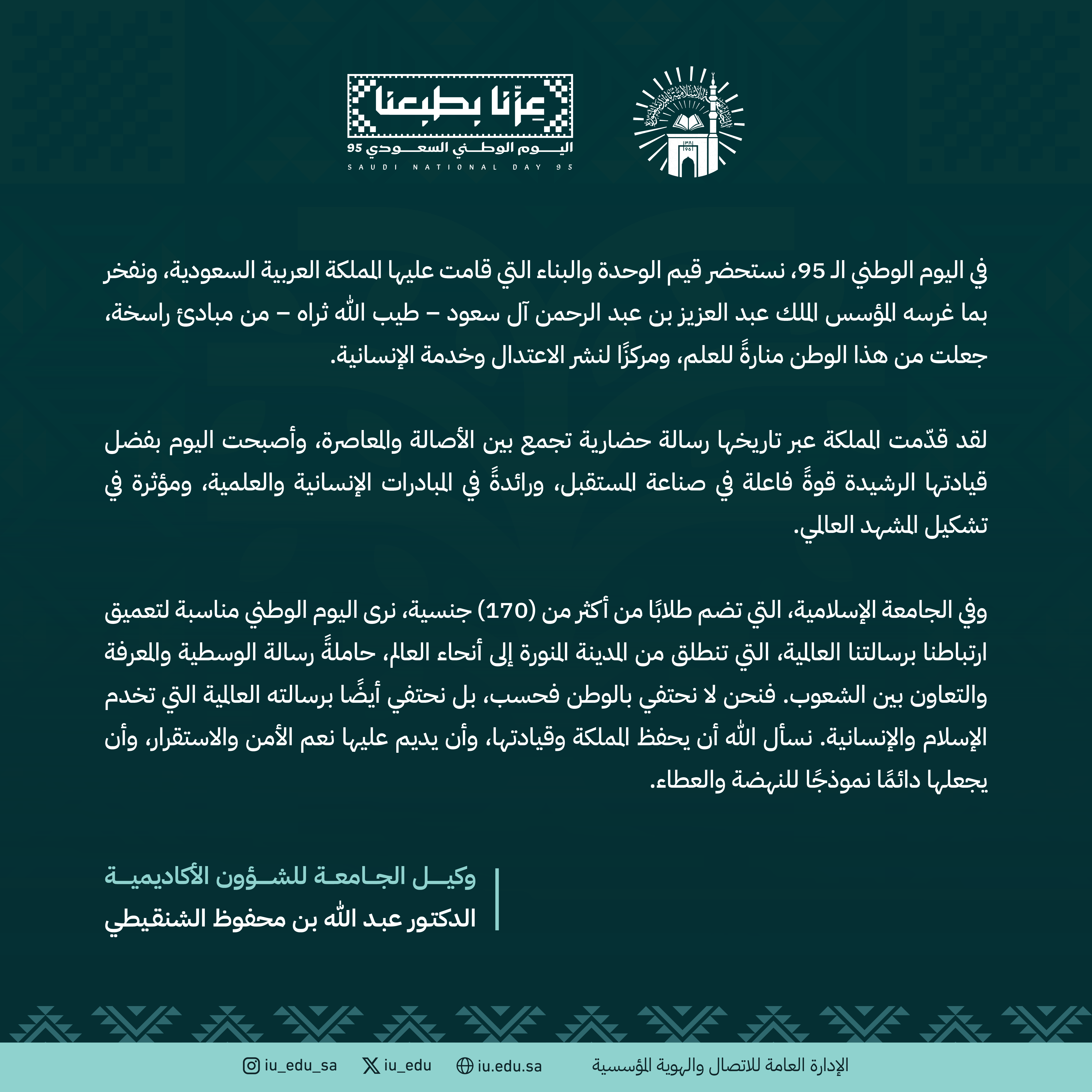 كلمة وكيل الجامعة الإسلامية للشؤون الأكاديمية، بمناسبة اليوم الوطني السعودي95.