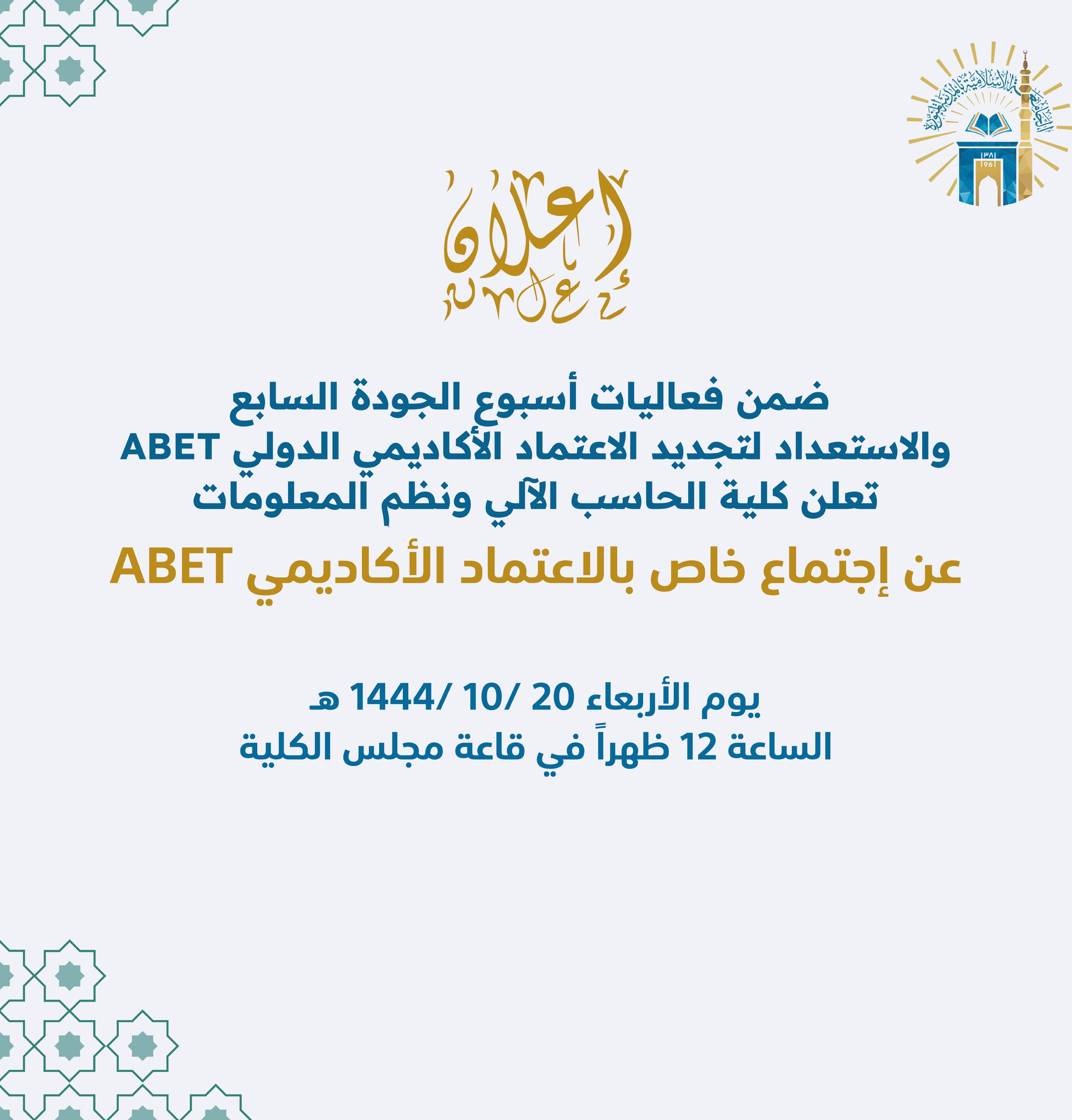 تعلن كلية الحاسب الآلي ونظم المعلومات ضمن فعاليات أسبوع الجودة السابع عن إقامة اجتماع خاص بالاعتماد الأكاديمي ABET وذلك