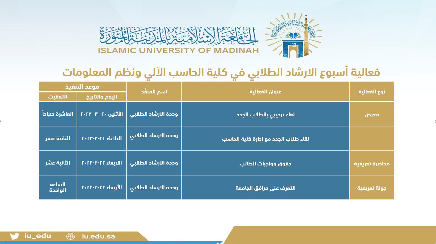 اقامت وحدة الارشاد الطلابي بكلية الحاسب الآلي ونظم المعلومات اسبوع الارشاد الطلابي للطلاب الجدد يوم الأربعاء الموافق ٢٢ مارس ٢٠٢٣م بحضور سعادة الدكتور محمد بن عيدة، البروفسور أحمد الخضر، والمحاضر عثمان الجيزاني