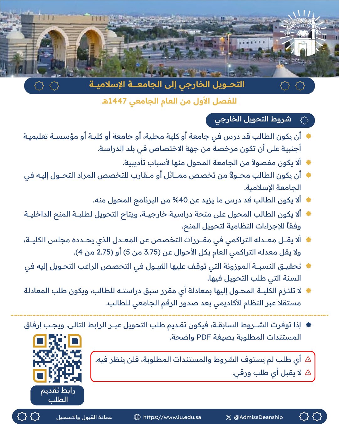 أعلنت عمادة القبول والتسجيل عن البدء باستقبال طلبات (التحويل الخارجي) من يوم الأحد 23-2-1447هـ، إلى يوم السبت 29-2-1447هـ.