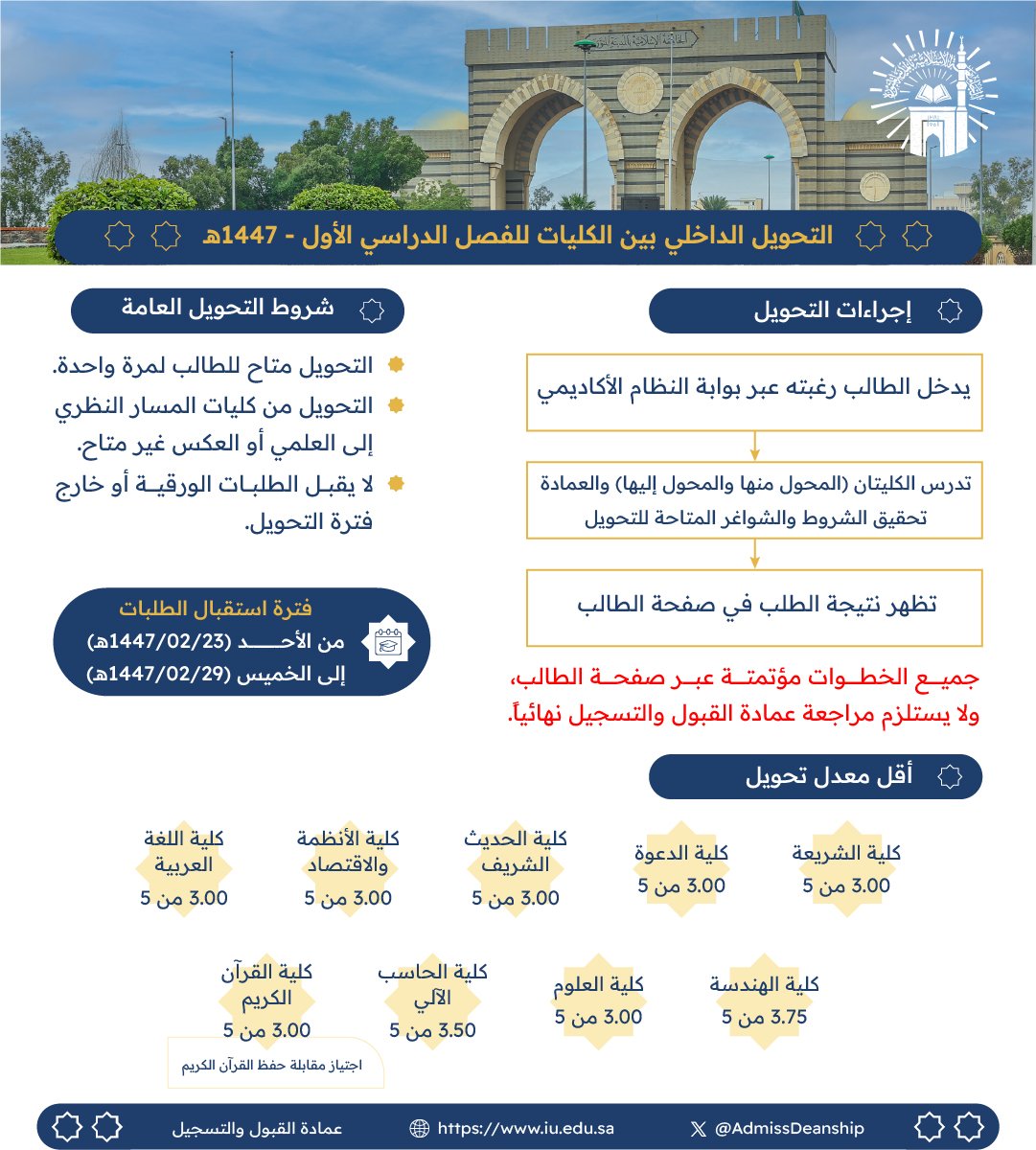 كما أعلنت عمادة القبول والتسجيل عن البدء باستقبال طلبات (التحويل الداخلي) بين الكليات، من يوم الأحد 23-2-1447هـ، إلى يوم السبت 29-2-1447هـ.