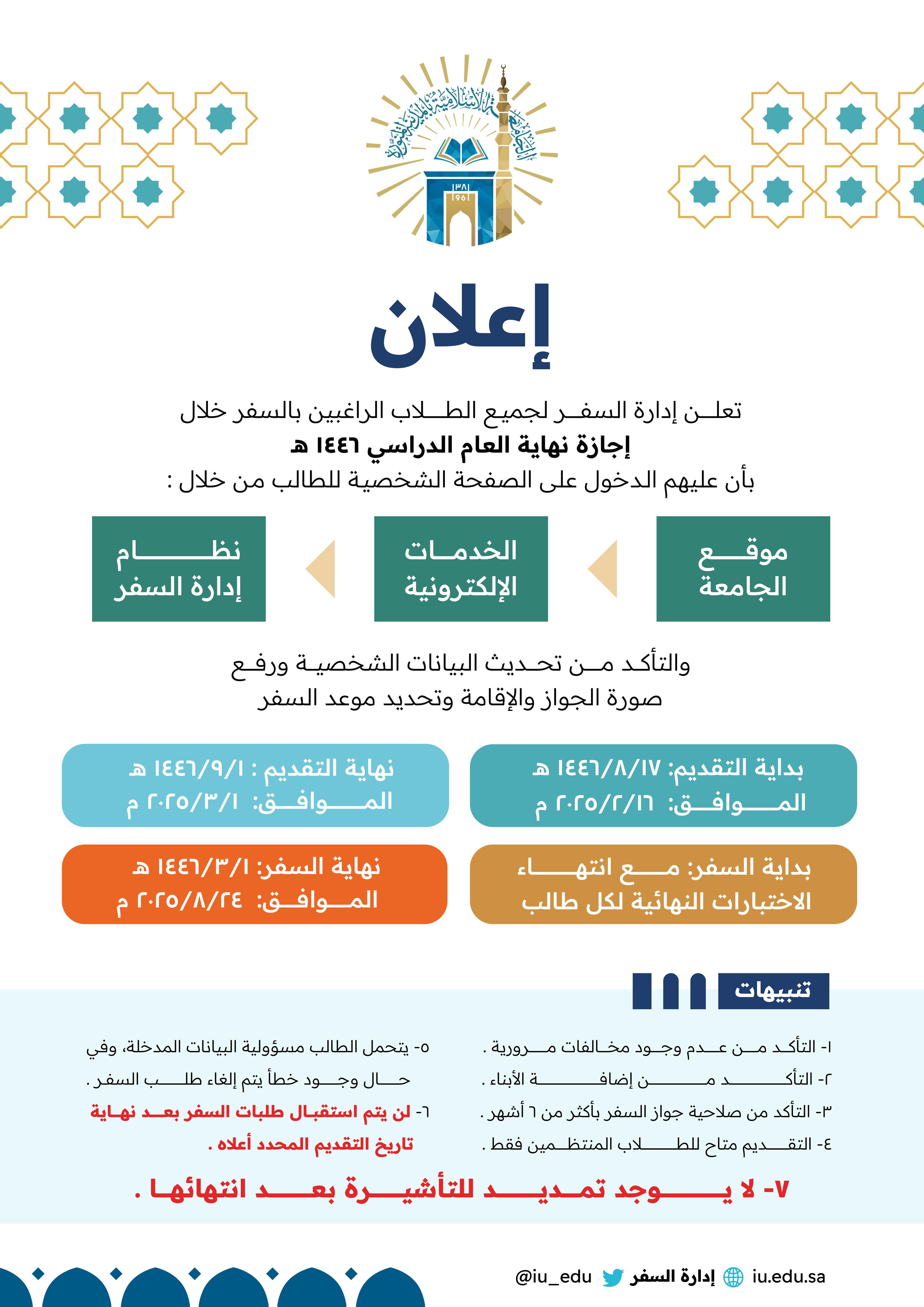 تعلن إدارة السفر عن فتح التقديم للسفر في الإجازة الصيفية لعام 1446 هـ للدفعة الأولى عبر البوابة الموحدة للطالب لطلاب المنح الخارجية المنتظمين، نأمل من الراغبين في السفر الدخــول للموقع وتحديث البيانات وتسجيل رغبة السفر ثم التسجيل في منصة اعتماد حسب طريقة التسجيل المعتمدة في منصة اعتماد