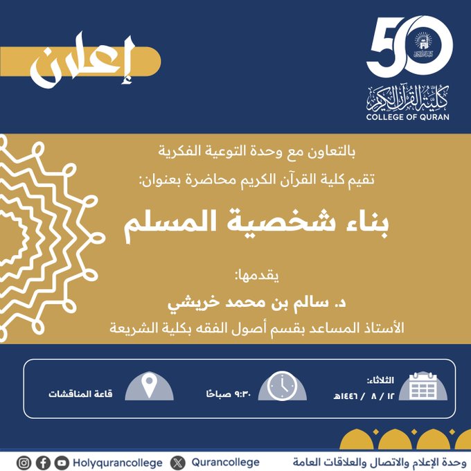 إعلان لقاء أكاديمي لطلاب كلية االقرآن الكريم بالتعاون مع وحدة التوعية الفكرية وعمادة شؤون الطلاب يوم الثلاثاء 12-شعبان 1446هـ