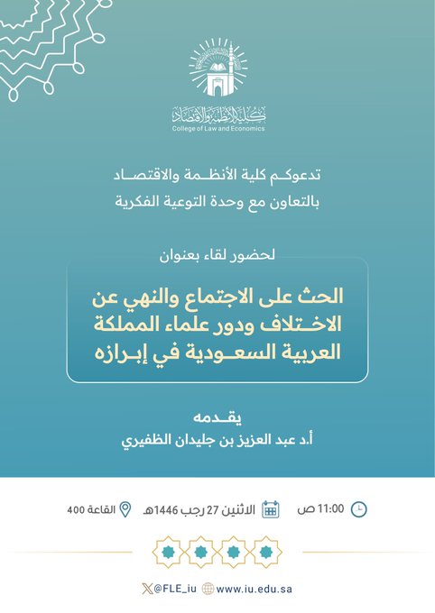 إعلان لقاء أكاديمي لطلاب كلية الأنظمة والاقتصاد بالتعاون مع وحدة التوعية الفكرية وعمادة شؤون الطلاب يوم الاثنين27-رجب 1446هـ