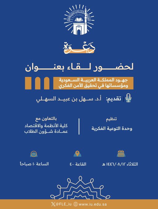 إعلان لقاء أكاديمي لطلاب كلية الأنظمة والاقتصاد بالتعاون مع وحدة التوعية الفكرية وعمادة شؤون الطلاب يوم الثلاثاء 12-شعبان 1446هـ