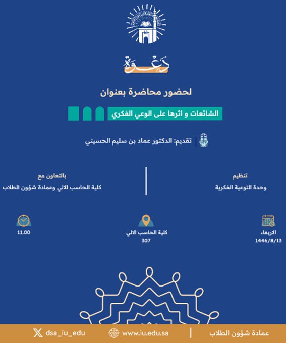 إعلان لقاء أكاديمي لطلاب كلية الحاسب الآلي بالتعاون مع وحدة التوعية الفكرية وعمادة شؤون الطلاب يوم الأربعاء 13-شعبان 1446هـ