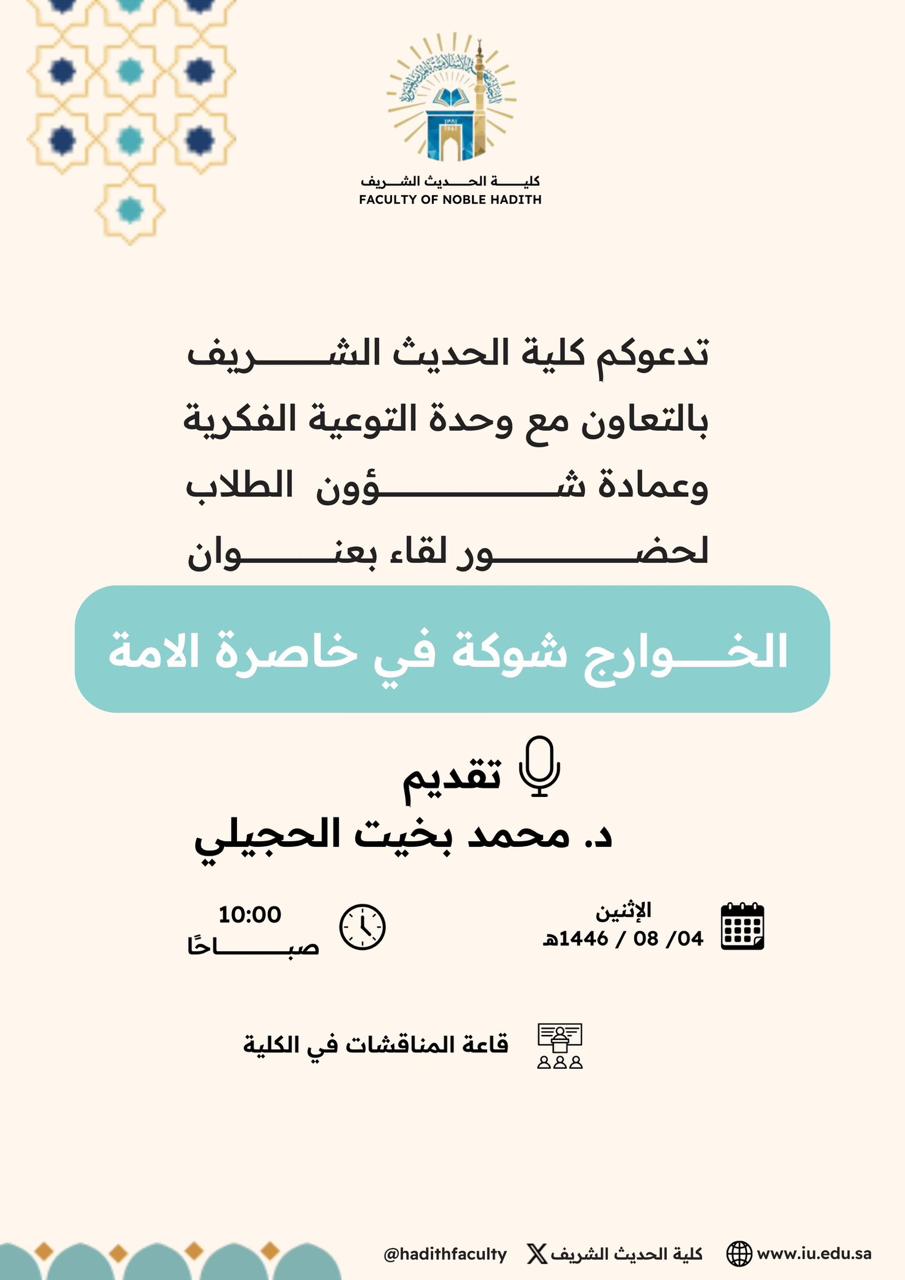 إعلان لقاء أكاديمي لطلاب كلية الحديث الشريف بالتعاون مع وحدة التوعية الفكرية وعمادة شؤون الطلاب يوم الاثنين 04-شعبان 1446هـ