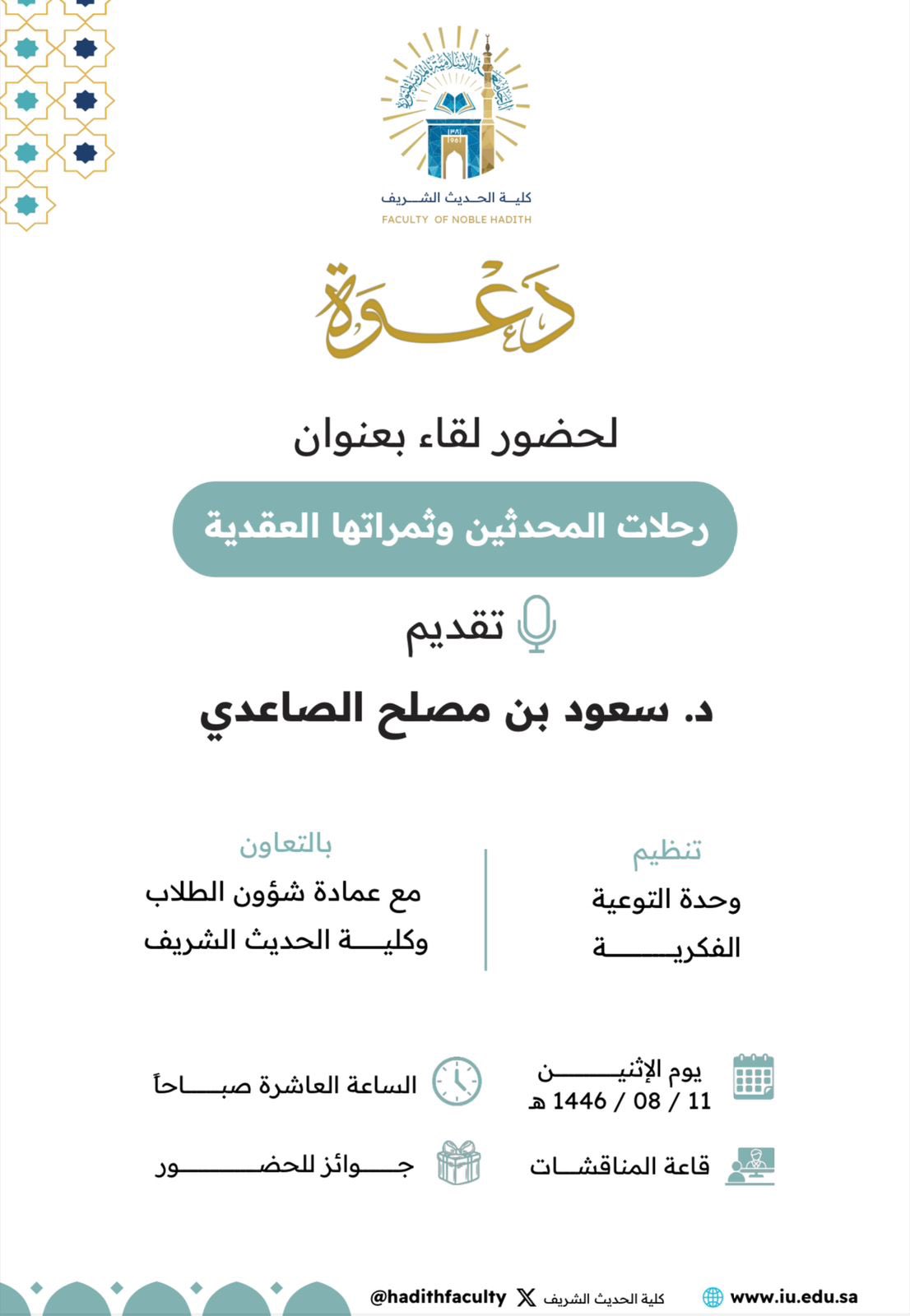 إعلان لقاء أكاديمي لطلاب كلية الحديث الشريف بالتعاون مع وحدة التوعية الفكرية وعمادة شؤون الطلاب يوم الاثنين 11-شعبان 1446هـ