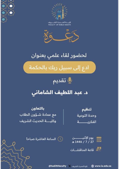 إعلان لقاء أكاديمي لطلاب كلية الحديث والدراسات الإسلامية بالتعاون مع وحدة التوعية الفكرية وعمادة شؤون الطلاب يوم الاثنين27-رجب 1446هـ