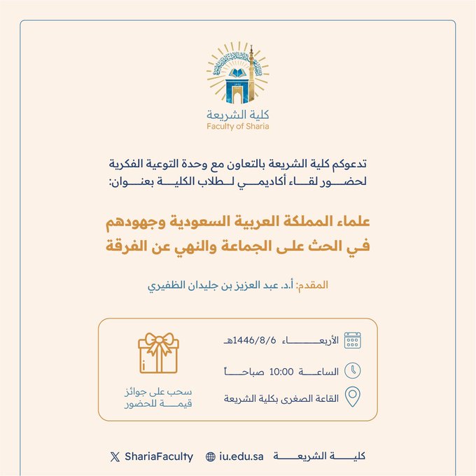 إعلان لقاء أكاديمي لطلاب كلية الشريعة بالتعاون مع وحدة التوعية الفكرية وعمادة شؤون الطلاب يوم الأربعاء 06-شعبان 1446هـ