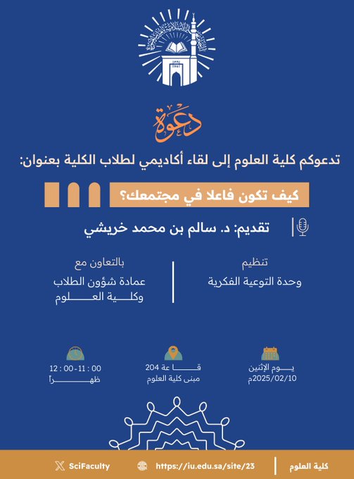 إعلان لقاء أكاديمي لطلاب كلية العلوم بالتعاون مع وحدة التوعية الفكرية وعمادة شؤون الطلاب يوم الاثنين 11-شعبان 1446هـ
