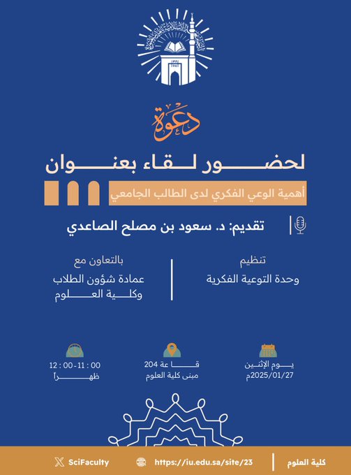 إعلان لقاء أكاديمي لطلاب كلية العلوم بالتعاون مع وحدة التوعية الفكرية وعمادة شؤون الطلاب يوم الاثنين27-رجب 1446هـ