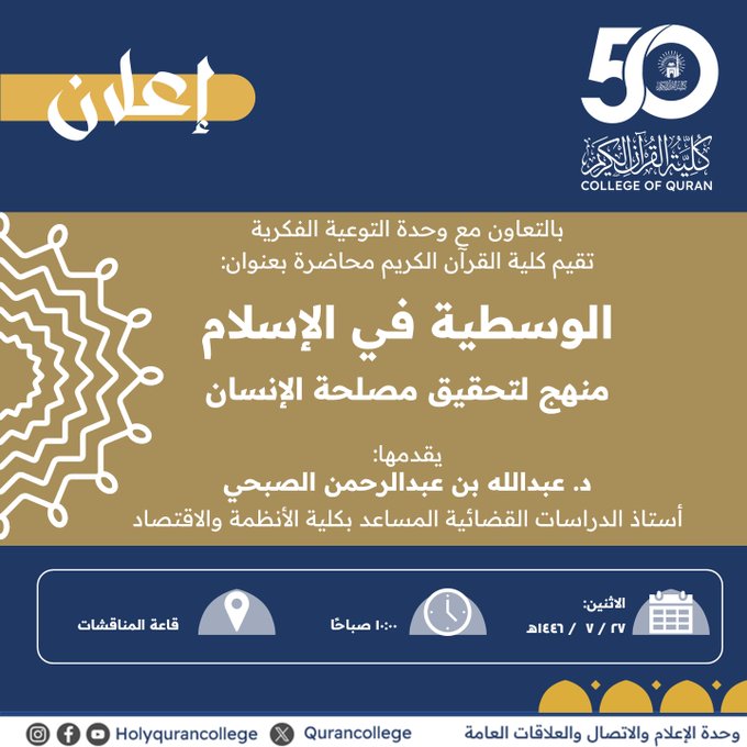 إعلان لقاء أكاديمي لطلاب كلية القرآن الكريم بالتعاون مع وحدة التوعية الفكرية وعمادة شؤون الطلاب يوم الاثنين27-رجب 1446هـ