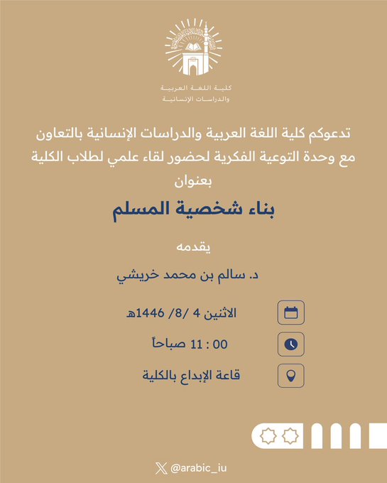 إعلان لقاء أكاديمي لطلاب كلية اللغة العربية والدراسات الإنسانية بالتعاون مع وحدة التوعية الفكرية وعمادة شؤون الطلاب يوم الاثنين 04-شعبان 1446هـ