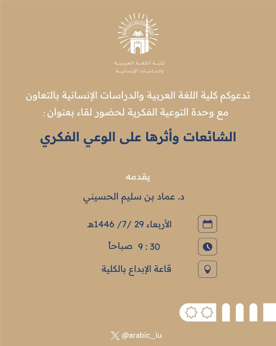 إعلان لقاء أكاديمي لطلاب كلية اللغة العربية والدراسات الإنسانية بالتعاون مع وحدة التوعية الفكرية وعمادة شؤون الطلاب يوم الأربعاء 29-رجب 1446هـ