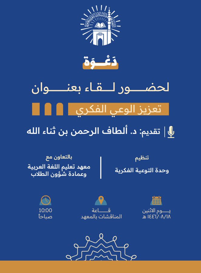 إعلان لقاء أكاديمي لطلاب معهد تعليم اللغة العربية بالتعاون مع وحدة التوعية الفكرية وعمادة شؤون الطلاب يوم الاثنين 18-شعبان-1446هـ