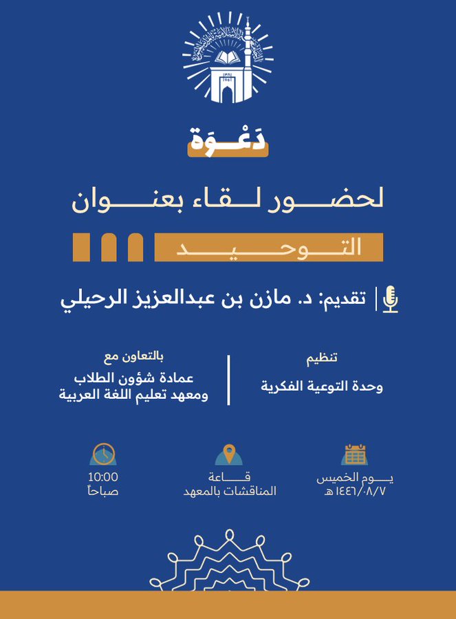 إعلان لقاء أكاديمي لطلاب معهد تعليم اللغة العربية بالتعاون مع وحدة التوعية الفكرية وعمادة شؤون الطلاب يوم الخميس 07-شعبان 1446هـ
